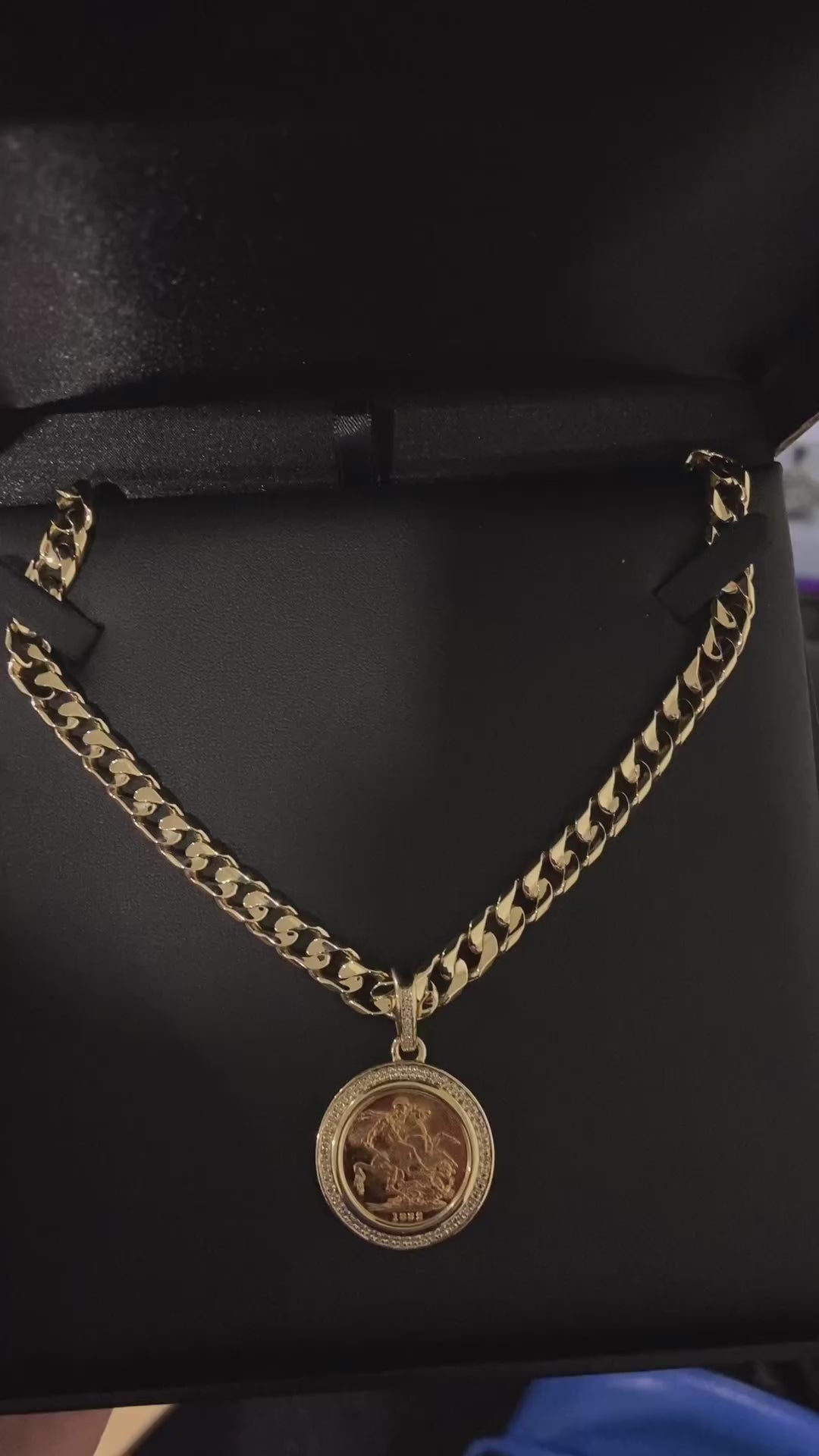 - Material: Gleaming 9k Gold cuban link 8 mm chain paired with a 22k full sovereign coin mounted in a double row of diamond pendant